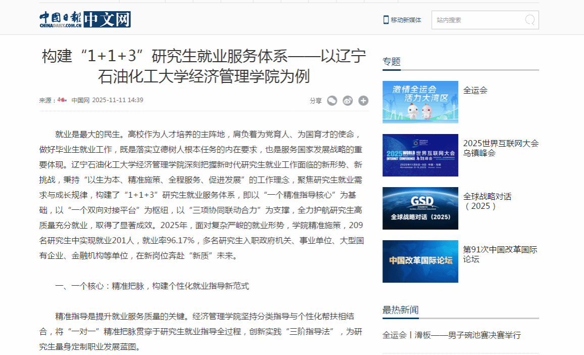 編者按:近日,中國日報、中國網(wǎng)、中國經(jīng)濟(jì)新聞網(wǎng)等媒體平臺對我校李浩方老師撰寫的理論文章《構(gòu)建“1+1+3”研究生就業(yè)服務(wù)體系——以遼寧石油化工大學(xué)經(jīng)濟(jì)管理學(xué)院為例》進(jìn)行了轉(zhuǎn)載報道。現(xiàn)將相關(guān)報道轉(zhuǎn)載如下: