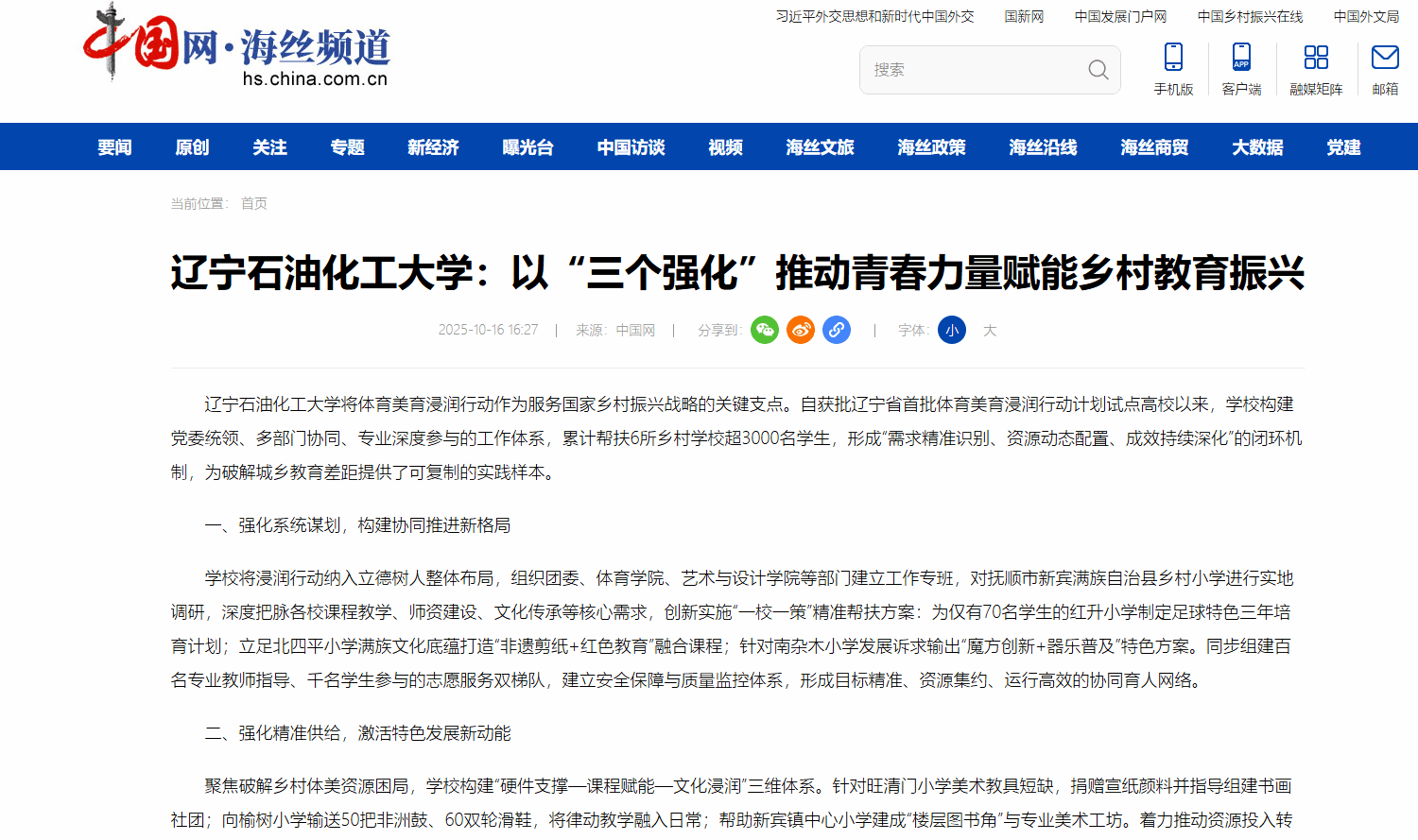 編者按:近日,中國(guó)網(wǎng)、中國(guó)經(jīng)濟(jì)新聞網(wǎng)、中國(guó)日?qǐng)?bào)網(wǎng)對(duì)我校團(tuán)委張國(guó)慶撰寫(xiě)的文章《遼寧石油化工大學(xué):以“三個(gè)強(qiáng)化”推動(dòng)青春力量賦能鄉(xiāng)村教育振興》進(jìn)行了宣傳報(bào)道。現(xiàn)將相關(guān)報(bào)道轉(zhuǎn)載如下: