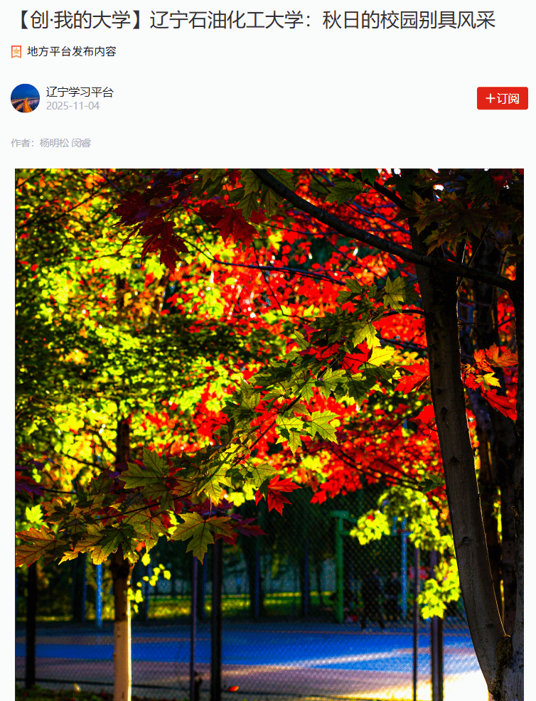 編者按:11月4日,學(xué)習(xí)強(qiáng)國(guó)遼寧學(xué)習(xí)平臺(tái)對(duì)我校新媒體中心學(xué)生楊明松、閔睿拍攝的學(xué)校秋季繽紛景色以圖集形式作了宣傳報(bào)道。現(xiàn)將相關(guān)報(bào)道轉(zhuǎn)載如下: