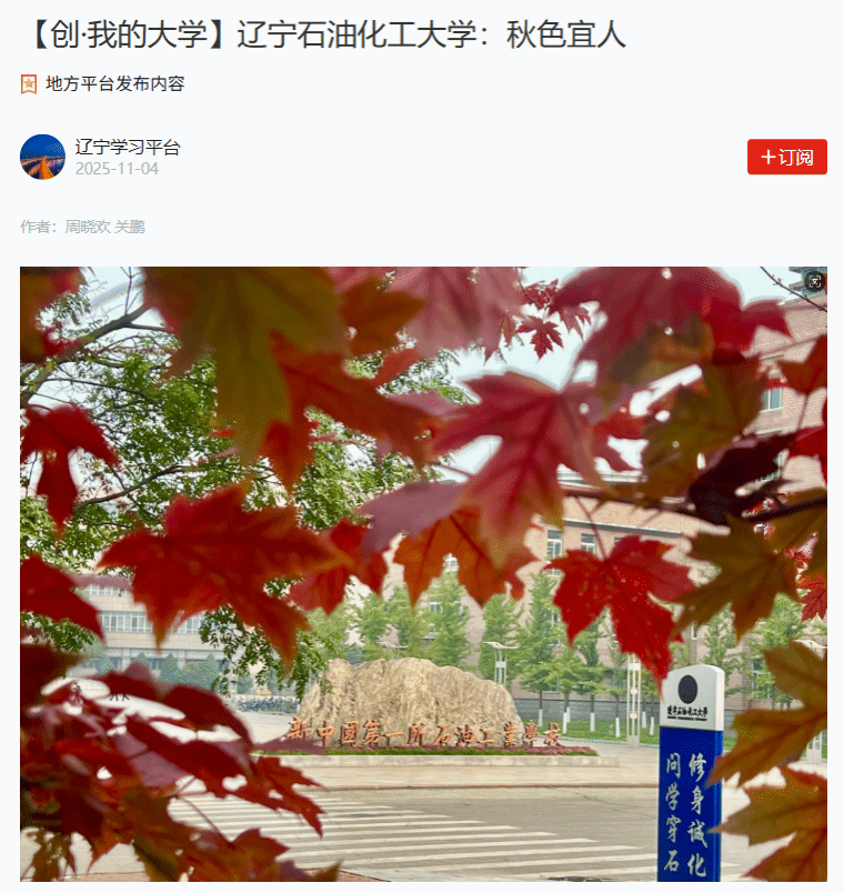 編者按:11月4日,學(xué)習(xí)強(qiáng)國(guó)遼寧學(xué)習(xí)平臺(tái)對(duì)我校周曉歡、關(guān)鵬老師拍攝的學(xué)校秋季繽紛景色以圖集形式作了宣傳報(bào)道。現(xiàn)將相關(guān)報(bào)道轉(zhuǎn)載如下: