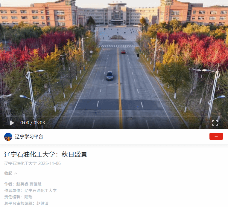 編者按:11月6日,學(xué)習(xí)強(qiáng)國(guó)平臺(tái)學(xué)習(xí)-青春中國(guó)-熱點(diǎn)欄目對(duì)我校新媒體中心學(xué)生趙英睿、賈佳慧拍攝的學(xué)校秋日盛景視頻作了宣傳報(bào)道。現(xiàn)將相關(guān)報(bào)道轉(zhuǎn)載如下: