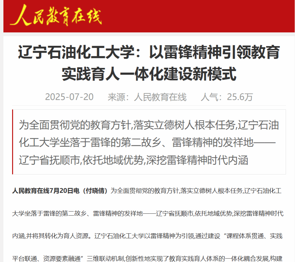 編者按:近日,人民教育在線(客戶端)、中國晨報網(wǎng)、中國網(wǎng)、中國社區(qū)發(fā)展網(wǎng)、中華網(wǎng)等媒體平臺對我校付曉倩老師撰寫的理論文章《遼寧石油化工大學(xué):以雷鋒精神引領(lǐng)教育實踐育人一體化建設(shè)新模式》進行了轉(zhuǎn)載報道。現(xiàn)將相關(guān)報道轉(zhuǎn)載如下: