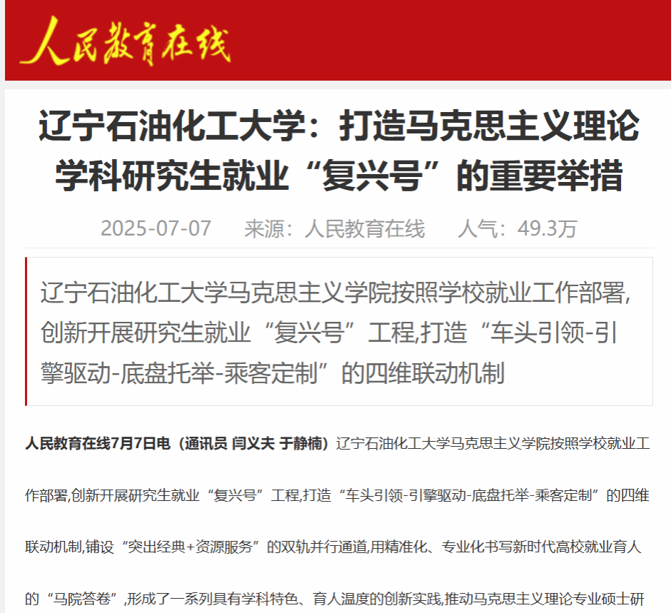 編者按:近日,人民教育在線(客戶端)、中國(guó)企業(yè)報(bào)官網(wǎng)、中國(guó)工業(yè)新聞網(wǎng)、中華網(wǎng)等媒體平臺(tái)對(duì)我校閆義夫老師撰寫(xiě)的理論文章《遼寧石油化工大學(xué):打造馬克思主義理論學(xué)科研究生就業(yè)“復(fù)興號(hào)”的重要舉措》進(jìn)行了轉(zhuǎn)載報(bào)道。現(xiàn)將相關(guān)報(bào)道轉(zhuǎn)載如下: