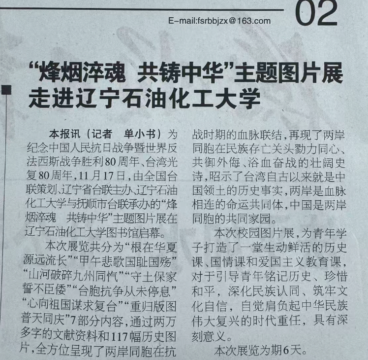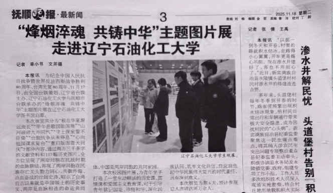 編者按:11月17日下午,由全國臺(tái)聯(lián)策劃,遼寧省臺(tái)聯(lián)主辦,我校與撫順市臺(tái)聯(lián)承辦的“烽煙淬魂 共鑄中華”主題圖片展在我校圖書館啟幕。全國臺(tái)聯(lián)副會(huì)長、遼寧省臺(tái)聯(lián)會(huì)長周琪,撫順市委統(tǒng)戰(zhàn)部副部長王彤,我校黨委書記霍慶生、黨委副書記鐘俊生等出席了開幕式。開幕式由我校黨委統(tǒng)戰(zhàn)部部長張燕主持。撫順日?qǐng)?bào)、撫順晚報(bào)、撫順電視臺(tái)以《“烽煙淬魂 共鑄中華”主題圖片展走進(jìn)遼寧石油化工大學(xué)》為題,對(duì)此進(jìn)行了宣傳報(bào)道。現(xiàn)將報(bào)道具體內(nèi)容轉(zhuǎn)載如下: