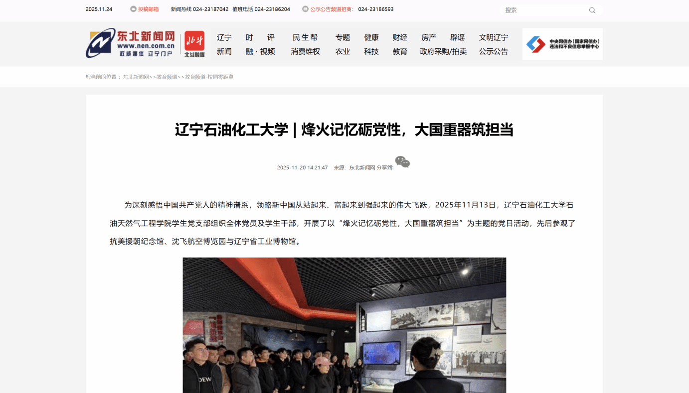編者按:11月13日,石油天然氣工程學(xué)院學(xué)生黨支部組織全體黨員及學(xué)生干部,開展了以“烽火記憶礪黨性,大國重器筑擔(dān)當(dāng)”為主題的黨日活動,先后參觀了抗美援朝紀(jì)念館、沈飛航空博覽園與遼寧省工業(yè)博物館。東北新聞網(wǎng)對此進行了宣傳報道。現(xiàn)將相關(guān)報道轉(zhuǎn)載如下:
