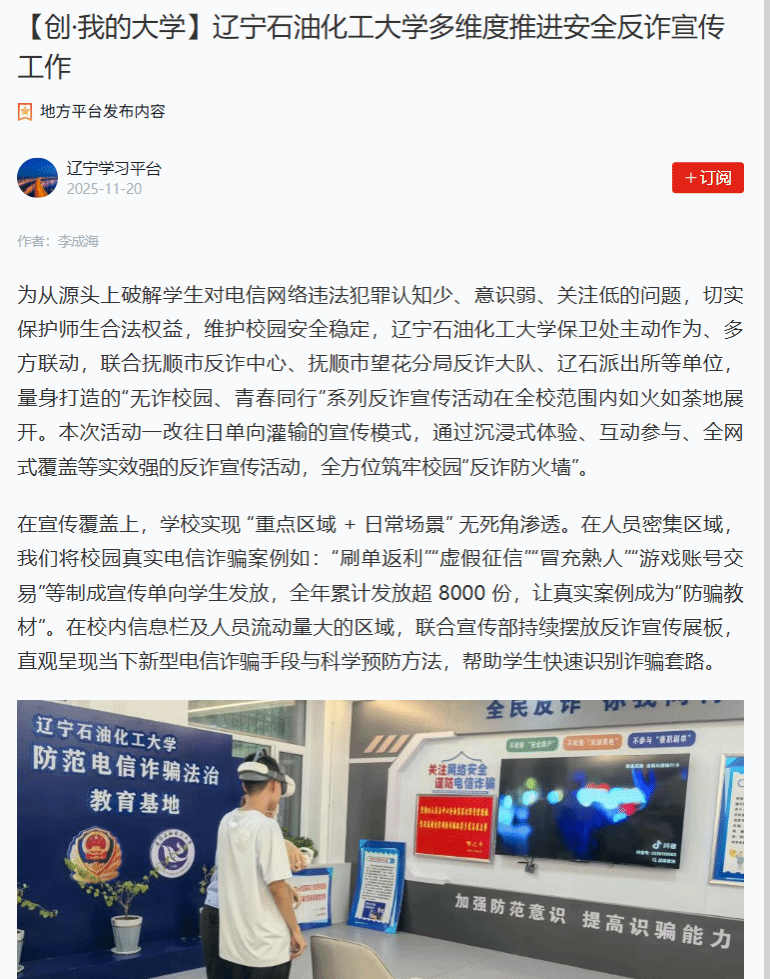 編者按:為從源頭上破解學(xué)生對(duì)電信網(wǎng)絡(luò)違法犯罪認(rèn)知少、意識(shí)弱、關(guān)注低的問題,切實(shí)保護(hù)師生合法權(quán)益,維護(hù)校園安全穩(wěn)定,遼寧石油化工大學(xué)保衛(wèi)處主動(dòng)作為、多方聯(lián)動(dòng),聯(lián)合撫順市反詐中心、撫順市望花分局反詐大隊(duì)、遼石派出所等單位,量身打造的“無(wú)詐校園、青春同行”系列反詐宣傳活動(dòng)在全校范圍內(nèi)如火如荼地展開。本次活動(dòng)一改往日單向灌輸?shù)男麄髂J剑ㄟ^沉浸式體驗(yàn)、互動(dòng)參與、全網(wǎng)式覆蓋等實(shí)效強(qiáng)的反詐宣傳活動(dòng),全方位筑牢校園“反詐防火墻”。學(xué)習(xí)強(qiáng)國(guó)遼寧學(xué)習(xí)平臺(tái)、人民日?qǐng)?bào)客戶端·人民號(hào)、遼寧日?qǐng)?bào)·遼望號(hào)、中國(guó)大學(xué)生網(wǎng)、搜狐號(hào)等媒體關(guān)注報(bào)道,引發(fā)廣泛反響。現(xiàn)將相關(guān)報(bào)道轉(zhuǎn)載如下: