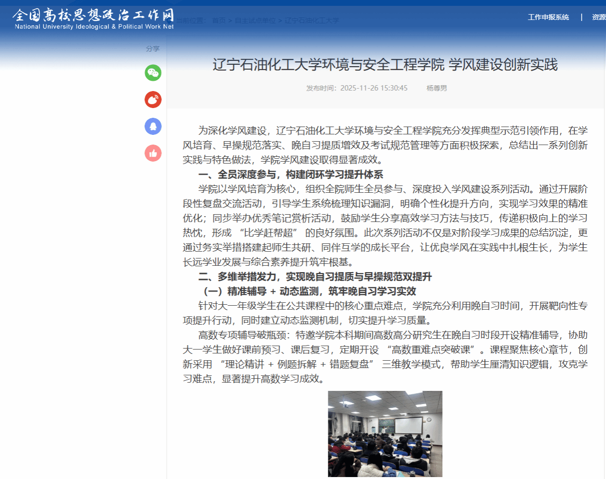編者按:為深化學(xué)風(fēng)建設(shè),遼寧石油化工大學(xué)環(huán)境與安全工程學(xué)院充分發(fā)揮典型示范引領(lǐng)作用,在學(xué)風(fēng)培育、早操規(guī)范落實(shí)、晚自習(xí)提質(zhì)增效及考試規(guī)范管理等方面積極探索,總結(jié)出一系列創(chuàng)新實(shí)踐與特色做法,學(xué)院學(xué)風(fēng)建設(shè)取得顯著成效。全國高校思想政治工作網(wǎng)(“一站式”學(xué)生社區(qū))對此進(jìn)行了宣傳報(bào)道。現(xiàn)將相關(guān)報(bào)道轉(zhuǎn)載如下: