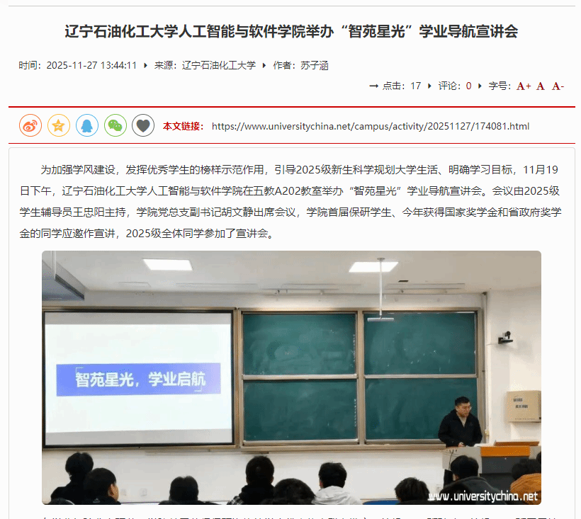 編者按:11月19日,遼寧石油化工大學(xué)人工智能與軟件學(xué)院以“榜樣領(lǐng)航育學(xué)風(fēng)”為核心,在五教A202教室舉辦“智苑星光”學(xué)業(yè)導(dǎo)航宣講會。活動搭建了高低年級交流互鑒平臺,助力學(xué)風(fēng)建設(shè)深化與新生成長規(guī)劃落地,中國大學(xué)生網(wǎng)對此進(jìn)行了宣傳報道,現(xiàn)將相關(guān)報道轉(zhuǎn)載如下:
