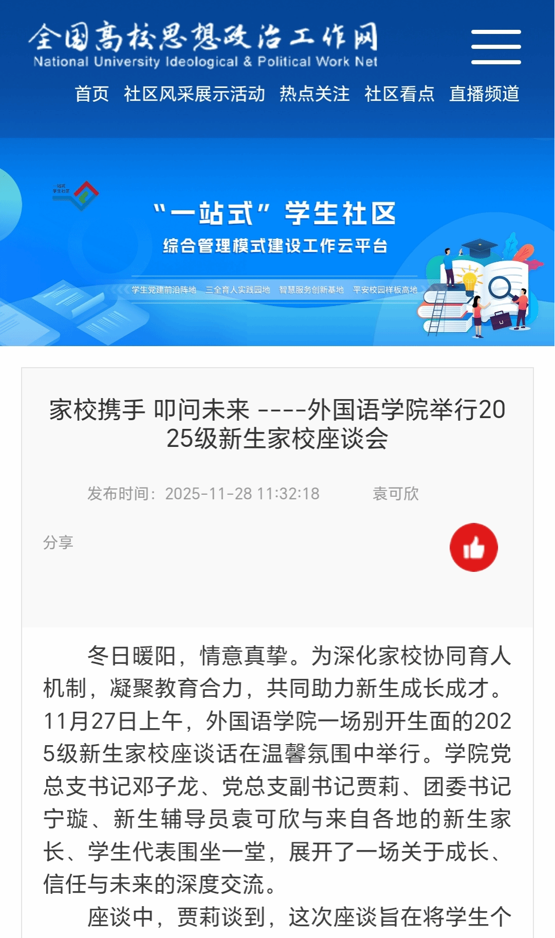 編者按:為深化家校協(xié)同育人機(jī)制,凝聚教育合力,共同助力新生成長成才。11月27日上午,遼寧石油化工大學(xué)外國語學(xué)院一場別開生面的2025級新生家校座談會在溫馨氛圍中舉行。全國高校思想政治工作網(wǎng)(“一站式”學(xué)生社區(qū))、中國大學(xué)生網(wǎng)對其內(nèi)容進(jìn)行了宣傳報道,現(xiàn)將相關(guān)報道轉(zhuǎn)載如下: