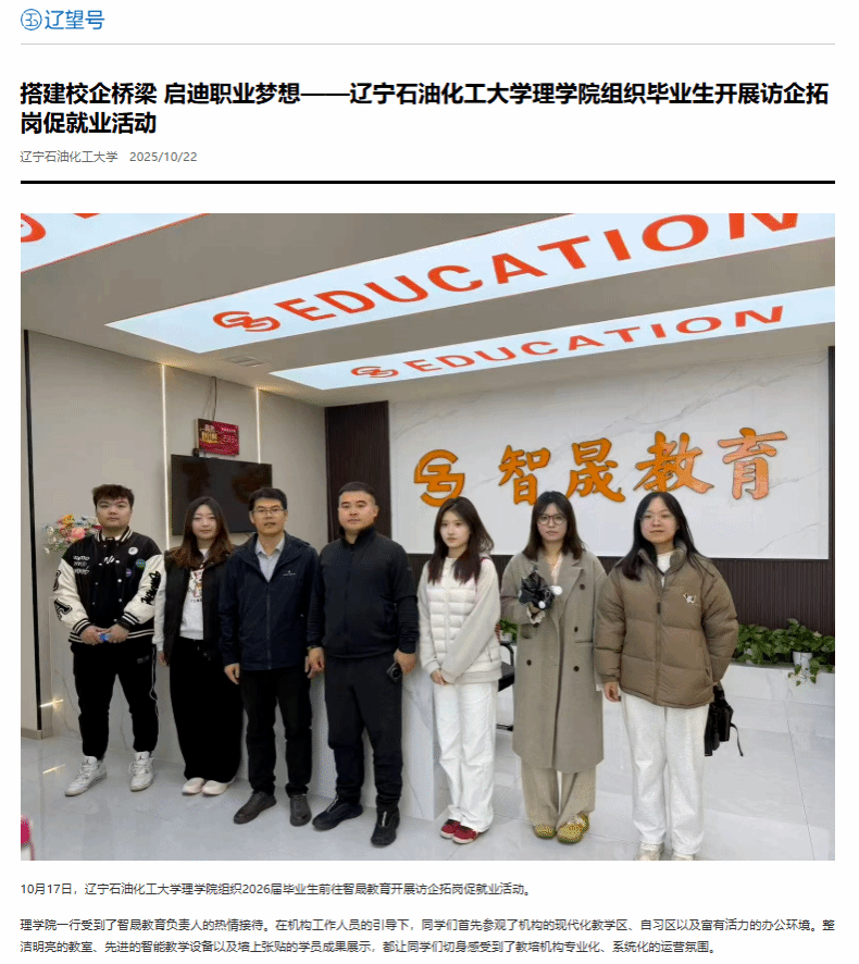 編者按:10月17日,遼寧石油化工大學(xué)理學(xué)院組織2026屆畢業(yè)生前往智晟教育開展訪企拓崗促就業(yè)活動(dòng)。中國大學(xué)生網(wǎng)、遼寧日?qǐng)?bào)·遼望號(hào)、搜狐網(wǎng)對(duì)此進(jìn)行了宣傳報(bào)道。現(xiàn)將相關(guān)報(bào)道轉(zhuǎn)載如下: