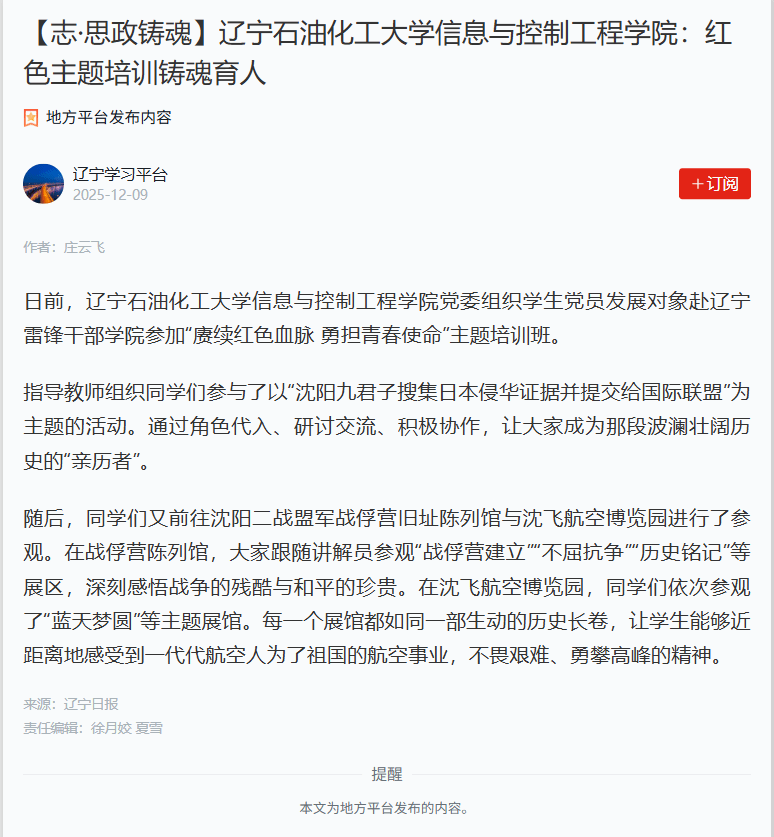編者按:近日,遼寧石油化工大學信息與控制工程學院黨委組織學生黨員發(fā)展對象赴遼寧雷鋒干部學院參加“賡續(xù)紅色血脈 勇擔青春使命”主題培訓班。學習強國遼寧學習平臺對此進行了宣傳報道。現將相關報道轉載如下: