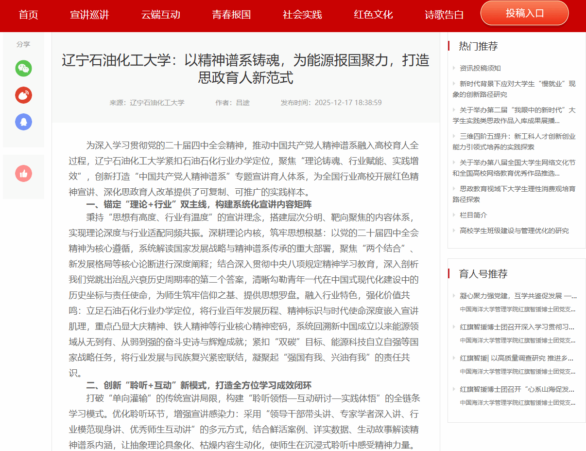 編者按:為深入學(xué)習(xí)貫徹黨的二十屆四中全會(huì)精神,推動(dòng)中國共產(chǎn)黨人精神譜系融入高校育人全過程,遼寧石油化工大學(xué)緊扣石油石化行業(yè)辦學(xué)定位,聚焦“理論鑄魂、行業(yè)賦能、實(shí)踐增效”,創(chuàng)新打造“中國共產(chǎn)黨人精神譜系”專題宣講育人體系,為全國行業(yè)高校開展紅色精神宣講、深化思政育人改革提供了可復(fù)制、可推廣的實(shí)踐樣本。全國高校思想政治工作網(wǎng)以"遼寧石油化工大學(xué):以精神譜系鑄魂,為能源報(bào)國聚力,打造思政育人新范式"為題,對(duì)此進(jìn)行了宣傳報(bào)道。現(xiàn)將相關(guān)報(bào)道轉(zhuǎn)載如下: