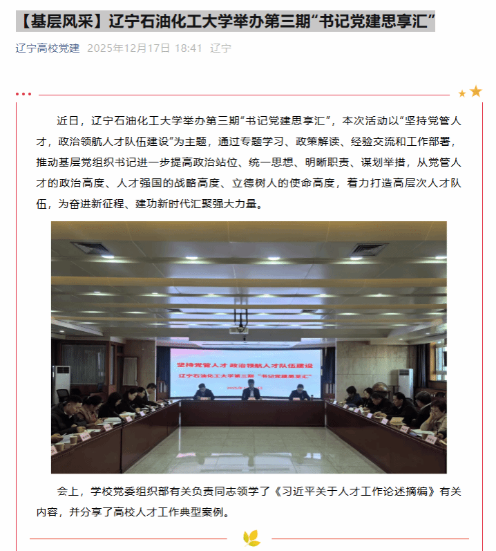 編者按:近日,學(xué)校舉辦第三期“書記黨建思享匯”,本次活動以“堅(jiān)持黨管人才,政治領(lǐng)航人才隊(duì)伍建設(shè)”為主題,通過專題學(xué)習(xí)、政策解讀、經(jīng)驗(yàn)交流和工作部署,推動基層黨組織書記進(jìn)一步提高政治站位、統(tǒng)一思想、明晰職責(zé)、謀劃舉措,從黨管人才的政治高度、人才強(qiáng)國的戰(zhàn)略高度、立德樹人的使命高度,著力打造高層次人才隊(duì)伍,為奮進(jìn)新征程、建功新時代匯聚強(qiáng)大力量。遼寧高校黨建微信公眾號對此進(jìn)行了宣傳報(bào)道。現(xiàn)將相關(guān)報(bào)道轉(zhuǎn)載如下:
