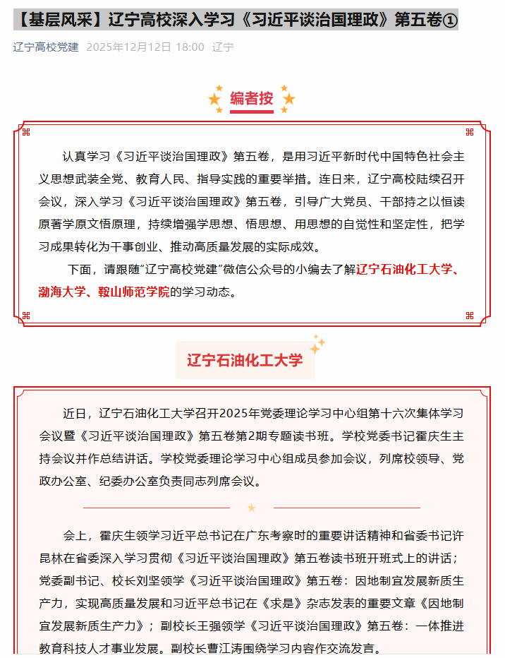 編者按:認(rèn)真學(xué)習(xí)《習(xí)近平談治國理政》第五卷,是用習(xí)近平新時代中國特色社會主義思想武裝全黨、教育人民、指導(dǎo)實踐的重要舉措。連日來,遼寧高校陸續(xù)召開會議,深入學(xué)習(xí)《習(xí)近平談治國理政》第五卷,引導(dǎo)廣大黨員、干部持之以恒讀原著學(xué)原文悟原理,持續(xù)增強學(xué)思想、悟思想、用思想的自覺性和堅定性,把學(xué)習(xí)成果轉(zhuǎn)化為干事創(chuàng)業(yè)、推動高質(zhì)量發(fā)展的實際成效。12月12日,遼寧高校黨建微信公眾號對我校的學(xué)習(xí)動態(tài)進行了組稿宣傳。現(xiàn)將相關(guān)報道轉(zhuǎn)載如下: