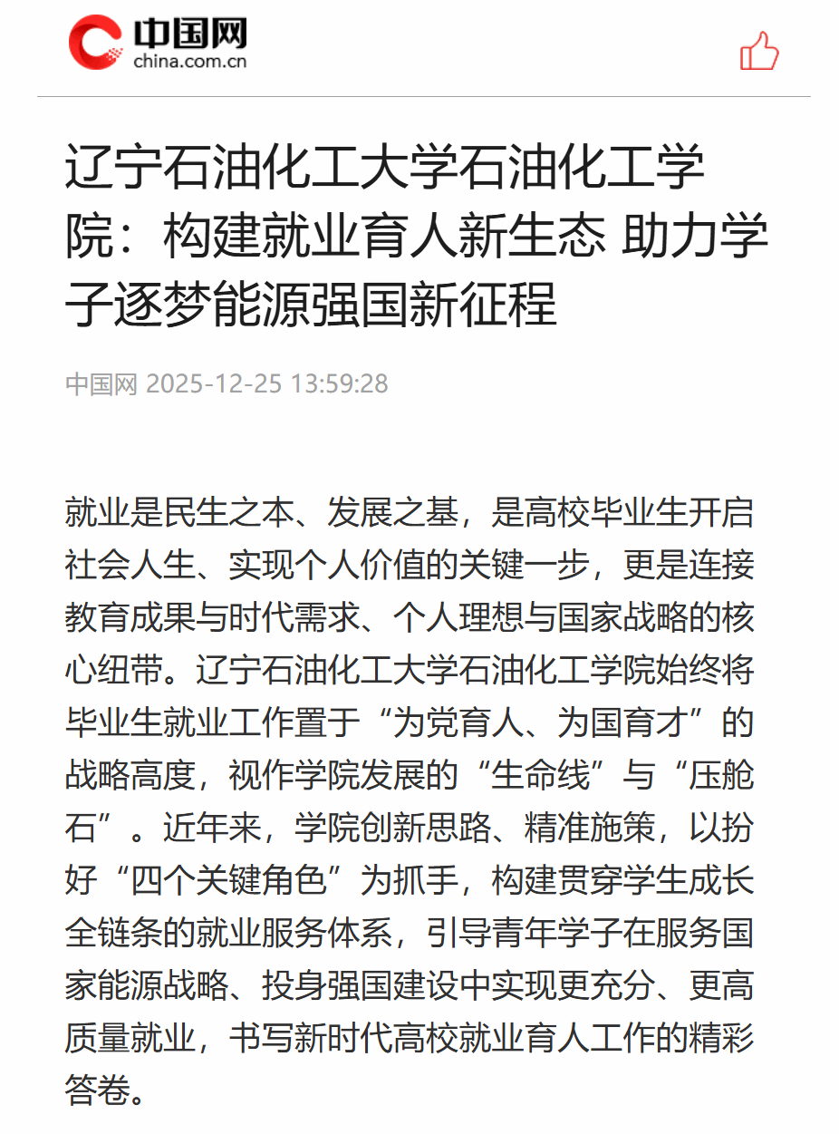 編者按:就業(yè)是民生之本、發(fā)展之基,是高校畢業(yè)生開(kāi)啟社會(huì)人生、實(shí)現(xiàn)個(gè)人價(jià)值的關(guān)鍵一步,更是連接教育成果與時(shí)代需求、個(gè)人理想與國(guó)家戰(zhàn)略的核心紐帶。遼寧石油化工大學(xué)石油化工學(xué)院始終將畢業(yè)生就業(yè)工作置于為黨育人、為國(guó)育才的戰(zhàn)略高度,視作學(xué)院發(fā)展的“生命線”與“壓艙石”。中國(guó)網(wǎng)、改革網(wǎng)、中華網(wǎng)對(duì)此工作進(jìn)行了宣傳報(bào)道,現(xiàn)將相關(guān)報(bào)道轉(zhuǎn)載如下: