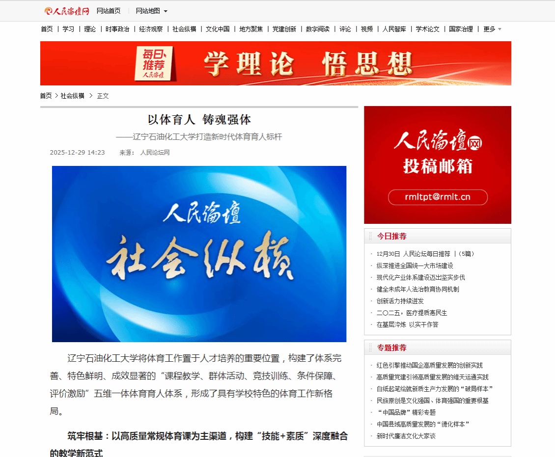 編者按:遼寧石油化工大學(xué)將體育工作置于人才培養(yǎng)的重要位置,構(gòu)建了體系完善、特色鮮明、成效顯著的“課程教學(xué)、群體活動(dòng)、競(jìng)技訓(xùn)練、條件保障、評(píng)價(jià)激勵(lì)”五維一體體育育人體系,形成了具有學(xué)校特色的體育工作新格局。12月29日,人民論壇網(wǎng)對(duì)此進(jìn)行了報(bào)道。現(xiàn)將相關(guān)報(bào)道轉(zhuǎn)載如下: