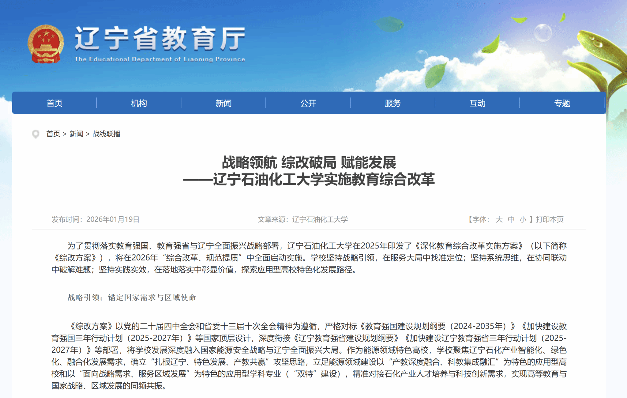 編者按:為貫徹落實教育強國、教育強省與遼寧全面振興戰(zhàn)略部署,我校在2025年印發(fā)了《深化教育綜合改革實施方案》,將在2026年“綜合改革、規(guī)范提質(zhì)”中全面啟動實施。近日,遼寧省教育廳網(wǎng)站對我校堅持戰(zhàn)略引領(lǐng),在服務(wù)大局中找準(zhǔn)定位;堅持系統(tǒng)思維,在協(xié)同聯(lián)動中破解難題;堅持實踐實效,在落地落實中彰顯價值,探索應(yīng)用型高校特色化發(fā)展路徑進行了報道。現(xiàn)將相關(guān)報道轉(zhuǎn)載如下: