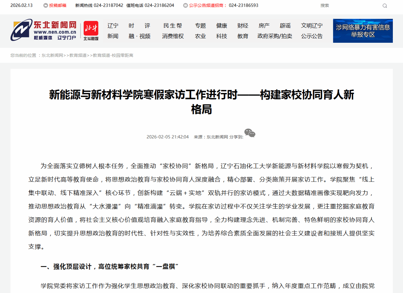 編者按:為全面落實(shí)立德樹(shù)人根本任務(wù),全面推動(dòng)“家校協(xié)同”新格局,遼寧石油化工大學(xué)新能源與新材料學(xué)院以寒假為契機(jī),立足新時(shí)代高等教育使命,將思想政治教育與家校協(xié)同育人深度融合,精心部署、分類(lèi)施策開(kāi)展家訪工作。學(xué)院家訪工作在東北新聞網(wǎng)進(jìn)行了宣傳報(bào)道,現(xiàn)將相關(guān)報(bào)道轉(zhuǎn)載如下: