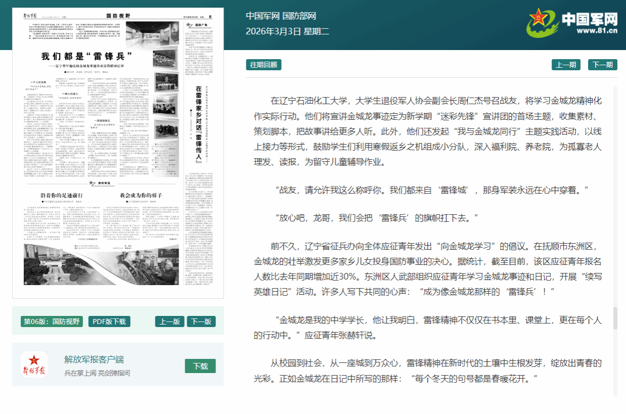編者按:3月3日,《解放軍報(bào)》紙媒第6版、《中國國防報(bào)》紙媒第3版,國防部網(wǎng)站、中國軍網(wǎng)、央廣網(wǎng)等刊發(fā)《我們都是“雷鋒兵”——遼寧省軍地弘揚(yáng)金城龍事跡傳承雷鋒精神記事》,對(duì)我校大學(xué)生退役軍人協(xié)會(huì)學(xué)習(xí)金城龍精神進(jìn)行了報(bào)道,現(xiàn)將相關(guān)報(bào)道轉(zhuǎn)載如下:
