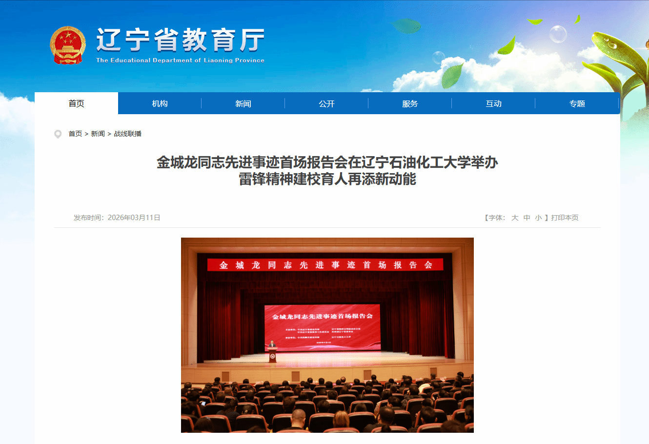 編者按:3月5日,在全國第63個“學雷鋒紀念日”到來之際,由中共遼寧省委宣傳部、遼寧省精神文明建設辦公室、中共遼寧省委教育工作委員會、共青團遼寧省委員會主辦,中共撫順市委宣傳部、遼寧石油化工大學承辦的金城龍同志先進事跡首場報告會在我校隆重舉辦,遼寧廣播電視臺、遼寧日報、遼寧省教育廳、北斗融媒、撫順新聞對報告會舉辦情況進行了報道。