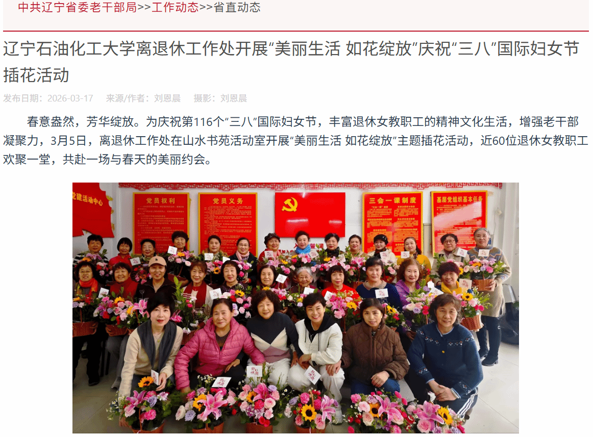 編者按:近日,中共遼寧省委老干部局官網(wǎng)登載了我校離退休工作處撰寫的文章《離退休工作處開展“美麗生活 如花綻放”慶祝“三八”國際婦女節(jié)插花活動》。現(xiàn)將相關(guān)報道轉(zhuǎn)載如下: