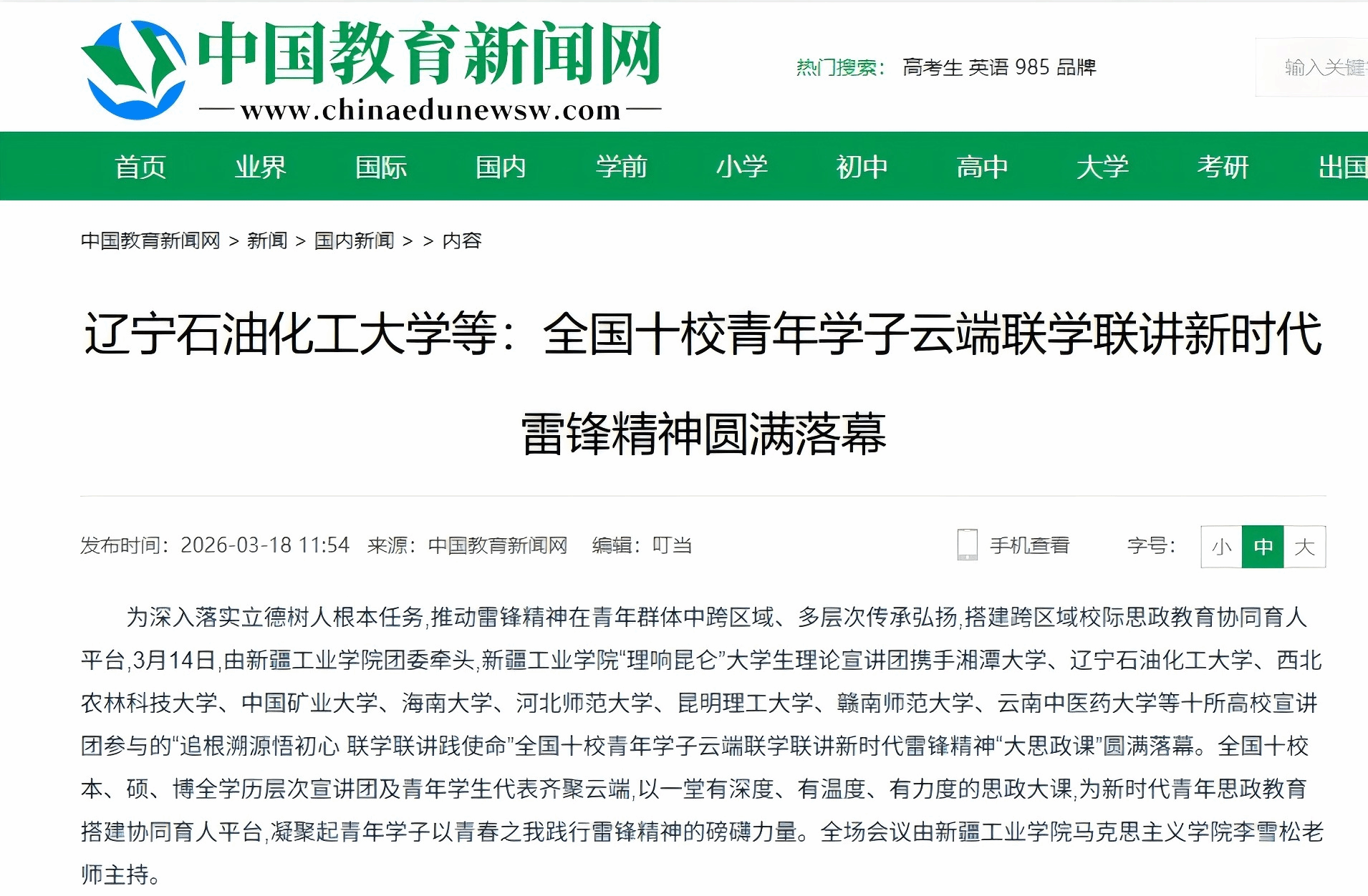 編者按:近日,中國(guó)教育新聞網(wǎng)、中華網(wǎng)等媒體平臺(tái)對(duì)我校聯(lián)合舉辦的“全國(guó)十校青年學(xué)子云端聯(lián)學(xué)聯(lián)講新時(shí)代雷鋒精神”進(jìn)行了宣傳報(bào)道。現(xiàn)將相關(guān)報(bào)道轉(zhuǎn)載如下: