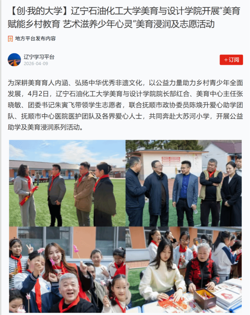 編者按:4月2日,遼寧石油化工大學(xué)美育與設(shè)計學(xué)院聯(lián)合撫順市政協(xié)委員愛心助學(xué)團隊、市中心醫(yī)院醫(yī)護團隊及各界愛心人士,赴大蘇河小學(xué)開展公益助學(xué)與美育浸潤活動,深耕美育育人、弘揚非遺文化,助力鄉(xiāng)村青少年發(fā)展,學(xué)習(xí)強國對此進行了報道。現(xiàn)將相關(guān)報道轉(zhuǎn)載如下: