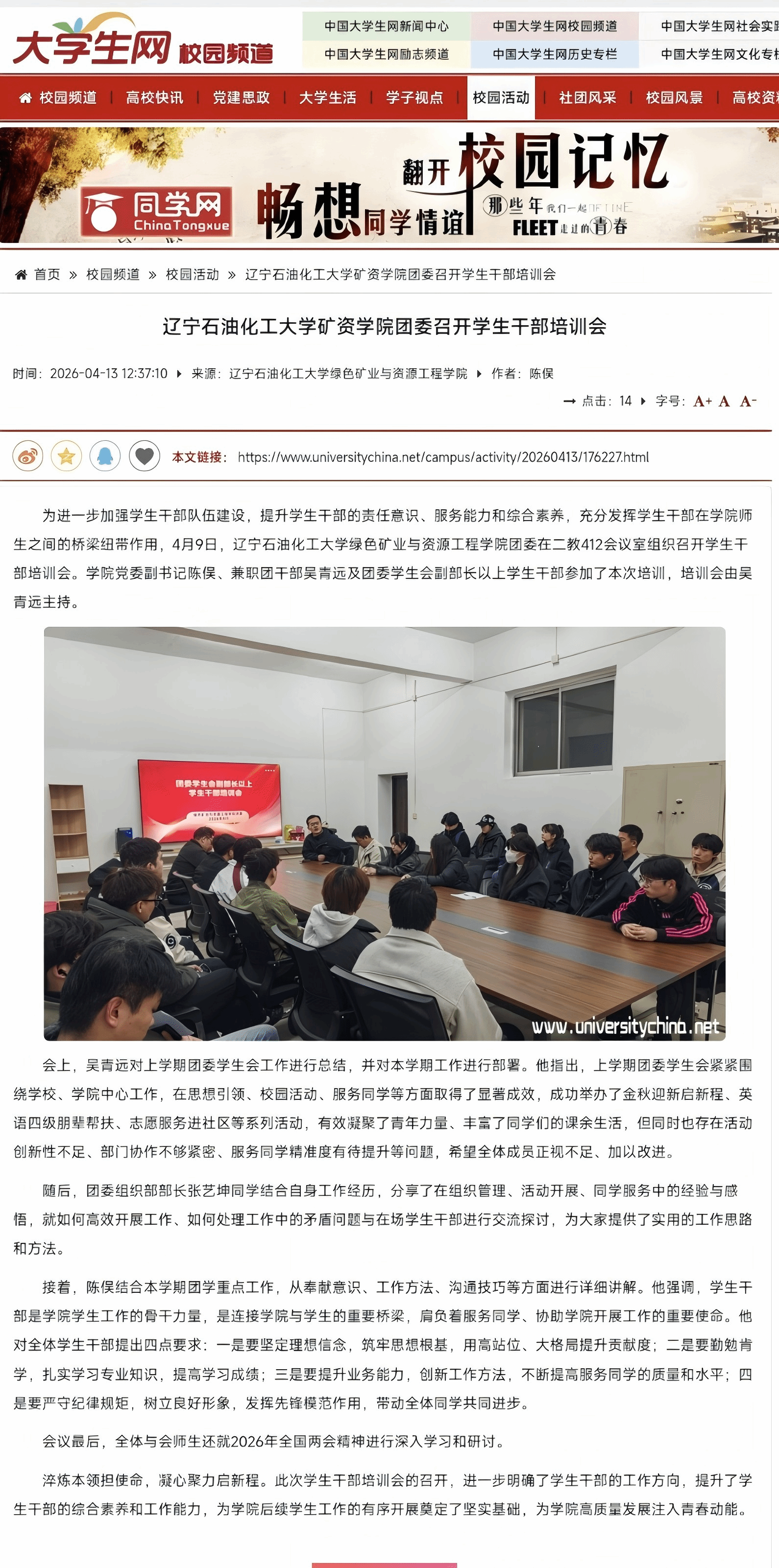 編者按:為進一步加強學生干部隊伍建設,提升學生干部的責任意識、服務能力和綜合素養(yǎng),充分發(fā)揮學生干部在學院師生之間的橋梁紐帶作用,4月9日,遼寧石油化工大學綠色礦業(yè)與資源工程學院團委在二教412會議室組織召開學生干部培訓會。中國大學生網對此進行了報道,現(xiàn)將相關報道轉載如下: