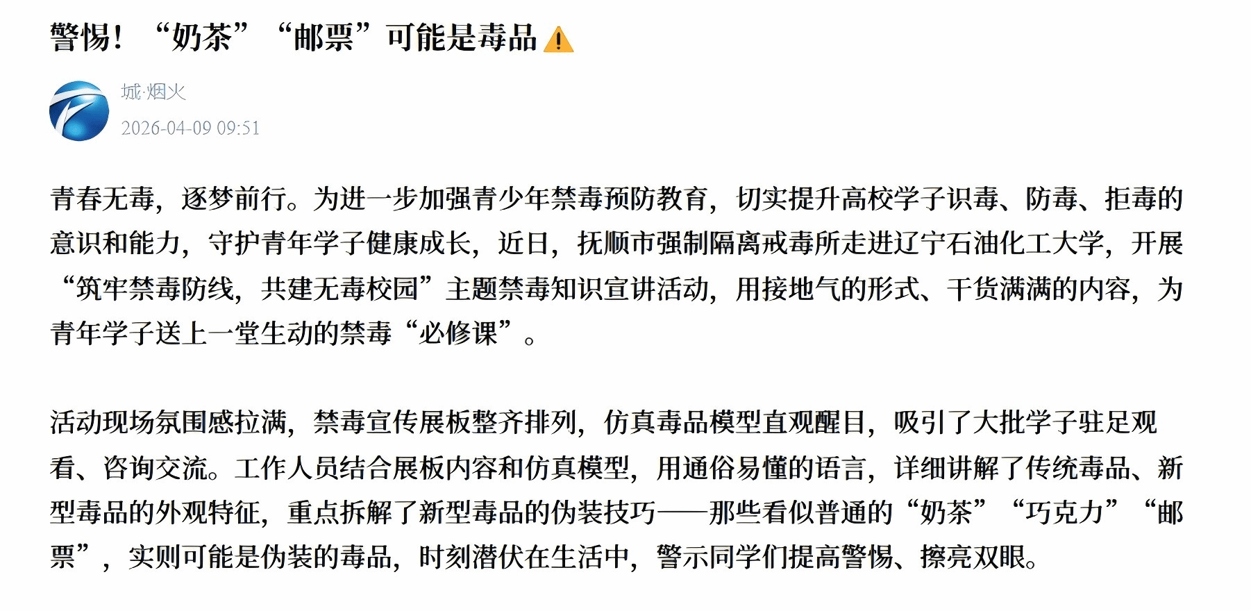 編者按:青春無毒,逐夢前行。為進(jìn)一步加強(qiáng)青少年禁毒預(yù)防教育,切實提升高校學(xué)子識毒、防毒、拒毒的意識和能力,守護(hù)青年學(xué)子健康成長,近日,撫順市強(qiáng)制隔離戒毒所走進(jìn)遼寧石油化工大學(xué),開展“筑牢禁毒防線,共建無毒校園”主題禁毒知識宣講活動,用接地氣的形式、干貨滿滿的內(nèi)容,為青年學(xué)子送上一堂生動的禁毒“必修課”。現(xiàn)將相關(guān)報道轉(zhuǎn)載如下: