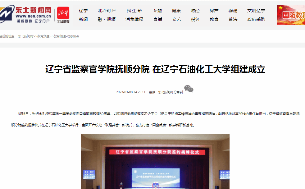 編者按:近日,東北新聞網(wǎng)對遼寧省監(jiān)察官學(xué)院撫順分院簽約揭牌儀式在我校舉行,全面開啟校地“聯(lián)建共管”新模式,奮力打造“國企反腐”教學(xué)科研新基地進行了宣傳報道。現(xiàn)將相關(guān)報道轉(zhuǎn)載如下: