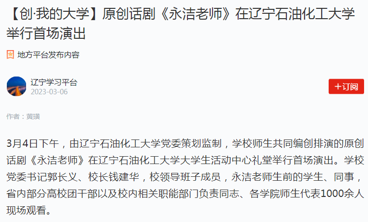編者按:近日,全國(guó)高校思想政治工作工作網(wǎng)、學(xué)習(xí)強(qiáng)國(guó)遼寧學(xué)習(xí)平臺(tái)、中央廣電總臺(tái)國(guó)際在線、北斗融媒、遼寧日?qǐng)?bào)·北國(guó)號(hào)、人民日?qǐng)?bào)客戶端·人民號(hào)等媒體平臺(tái)對(duì)我校師生共同編創(chuàng)排演的原創(chuàng)話劇《永潔老師》,于3月4日下午在大學(xué)生活動(dòng)中心禮堂舉行首場(chǎng)演出進(jìn)行了宣傳報(bào)道。現(xiàn)將相關(guān)報(bào)道轉(zhuǎn)載如下: