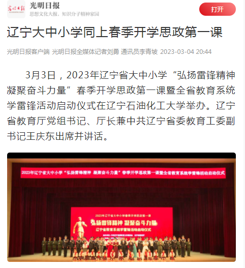 編者按:近日,光明日報客戶端、中國新聞網、遼寧省教育廳、中央廣電總臺國際在線、人民網 、遼沈身邊事、北斗融媒、遼寧衛(wèi)視、遼寧省人民政府網站、遼寧日報·北國號、中國教育報客戶端、云盛京、新浪新聞等媒體平臺對2023年遼寧省大中小學“弘揚雷鋒精神 凝聚奮斗力量”春季開學思政第一課暨全省教育系統(tǒng)學雷鋒活動啟動儀式在我校隆重舉行進行了宣傳報道。現將相關報道轉載如下: