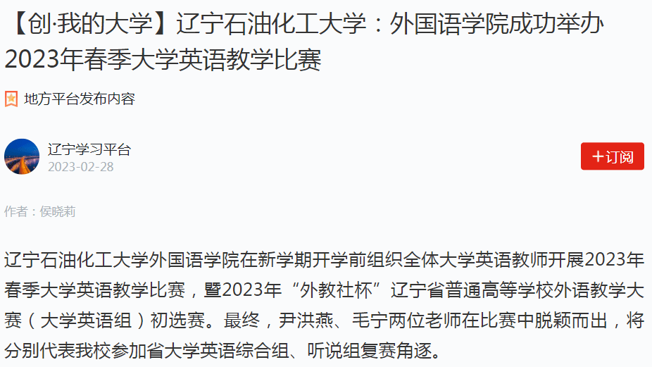 編者按:近日,學(xué)習(xí)強(qiáng)國遼寧學(xué)習(xí)平臺、遼寧日報(bào)·北國號、人民日報(bào)客戶端·人民號等媒體平臺對我校外國語學(xué)院在新學(xué)期開學(xué)前組織全體大學(xué)英語教師開展2023年春季大學(xué)英語教學(xué)比賽,暨2023年“外教社杯”遼寧省普通高等學(xué)校外語教學(xué)大賽(大學(xué)英語組)初選賽進(jìn)行了宣傳報(bào)道。現(xiàn)將相關(guān)報(bào)道轉(zhuǎn)載如下: