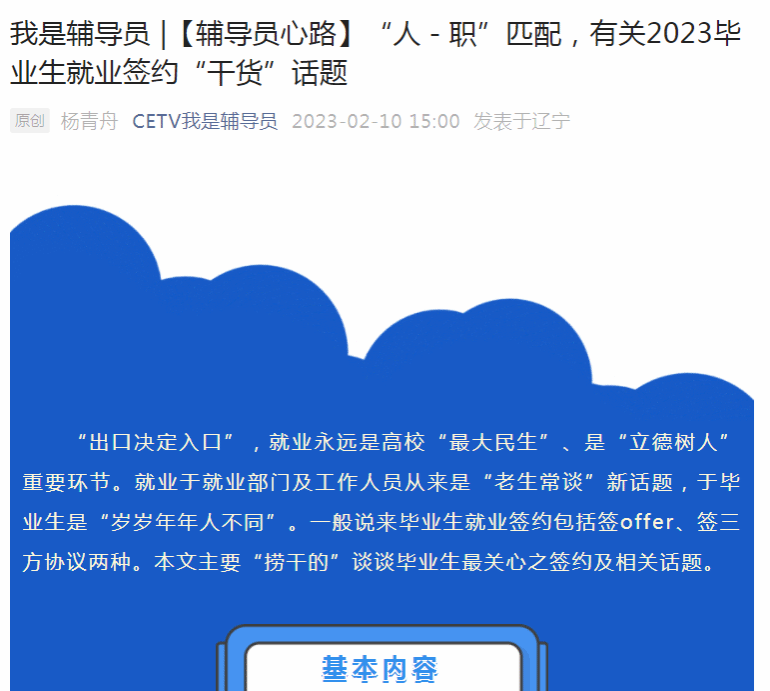 編者按:近日,中國教育電視臺“CETV我是輔導員微信公眾號”對我校楊青舟老師撰寫的文章《“人-職”匹配,有關2023畢業(yè)生就業(yè)簽約“干貨”話題》進行了宣傳報道。現(xiàn)將相關報道轉載如下: