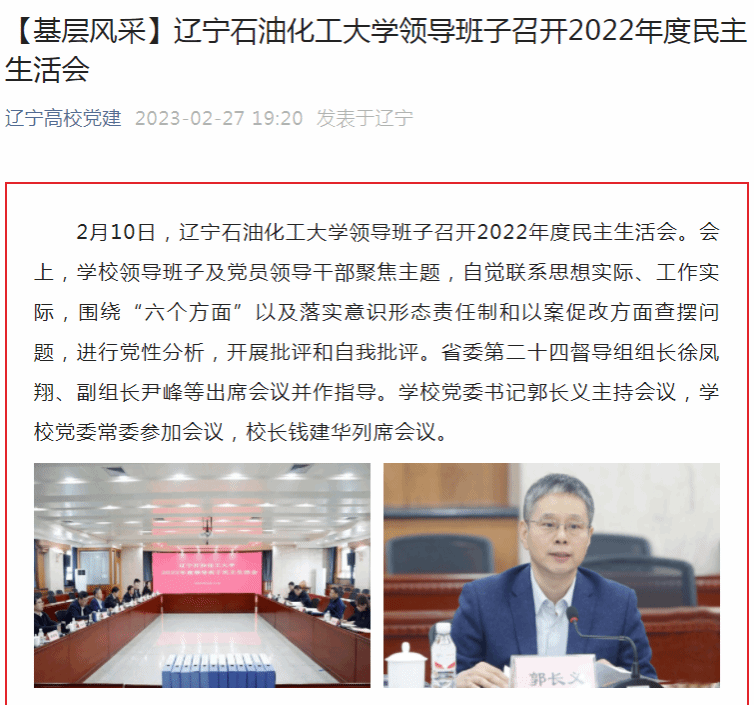 編者按:近日,遼寧高校黨建微信公眾號對我校領(lǐng)導班子召開2022年度民主生活會進行了宣傳報道。現(xiàn)將相關(guān)報道轉(zhuǎn)載如下: