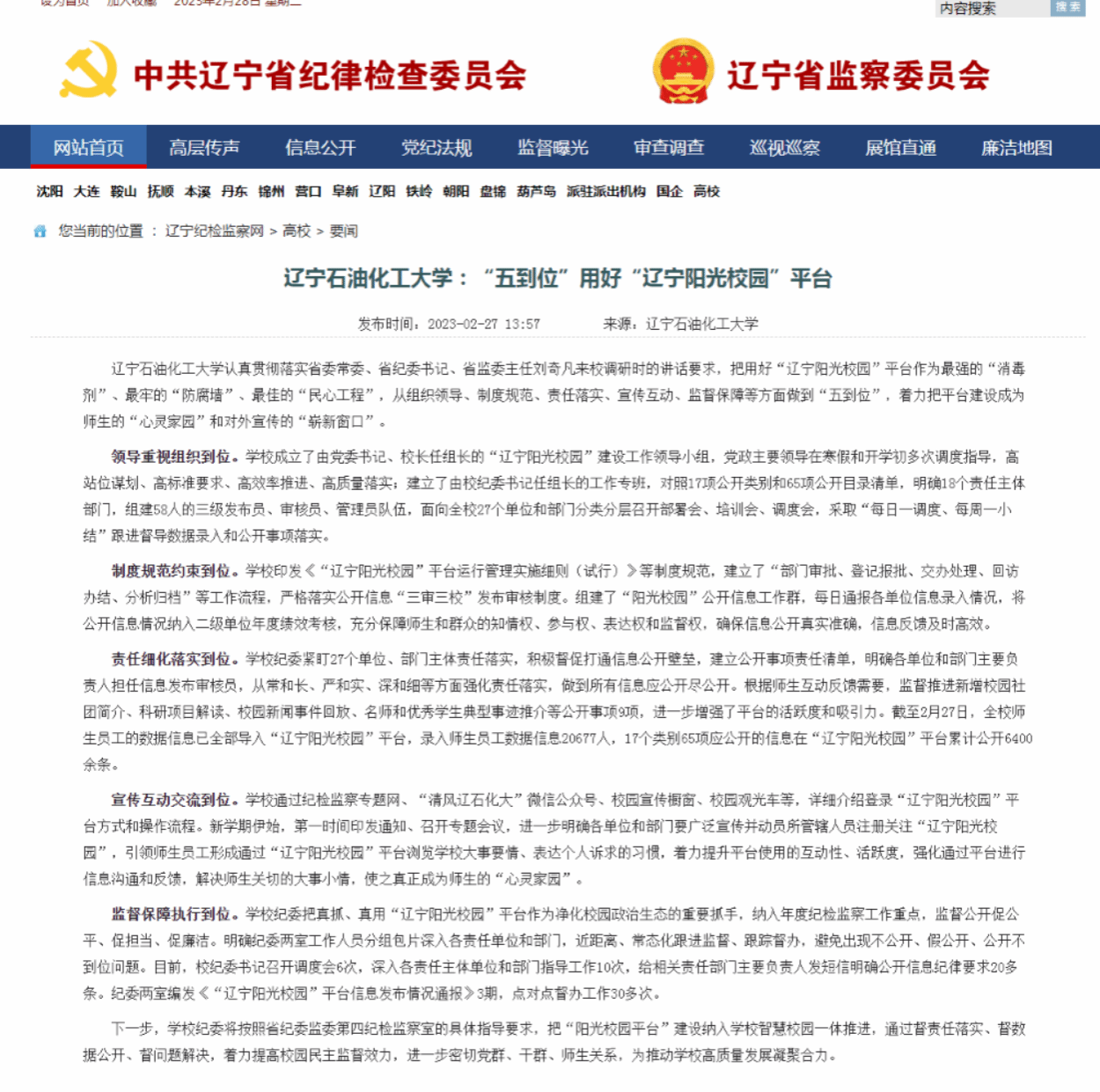 編者按:近日,遼寧紀(jì)檢監(jiān)察網(wǎng)對我校認(rèn)真貫徹落實(shí)省委常委、省紀(jì)委書記、省監(jiān)委主任劉奇凡來校調(diào)研時(shí)的講話要求,把用好“遼寧陽光校園”平臺作為最強(qiáng)的“消毒劑”、最牢的“防腐墻”、最佳的“民心工程”,從組織領(lǐng)導(dǎo)、制度規(guī)范、責(zé)任落實(shí)、宣傳互動、監(jiān)督保障等方面做到“五到位”,著力把平臺建設(shè)成為師生的“心靈家園”和對外宣傳的“嶄新窗口”進(jìn)行了宣傳報(bào)道。現(xiàn)將相關(guān)報(bào)道轉(zhuǎn)載如下: