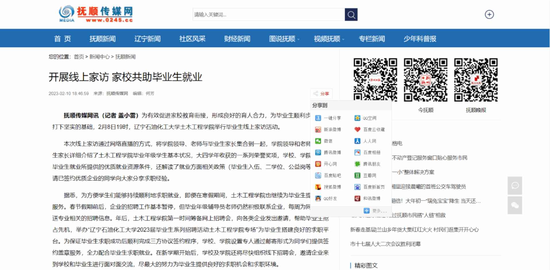 編者按:近日,我校土木工程學院開展線上家訪,家校共助畢業(yè)生就業(yè)工作在撫順傳媒網(wǎng)發(fā)表,現(xiàn)將相關報道轉(zhuǎn)載如下: