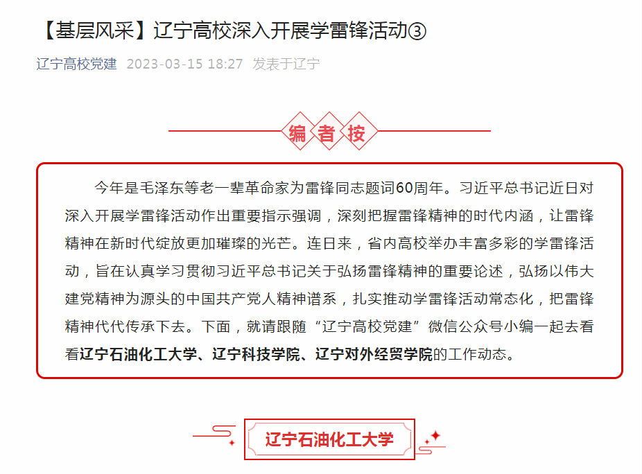 編者按:近日,遼寧高校黨建微信公眾號對我校開展學(xué)雷鋒活動進(jìn)行了組稿宣傳報道。現(xiàn)將相關(guān)報道轉(zhuǎn)載如下: