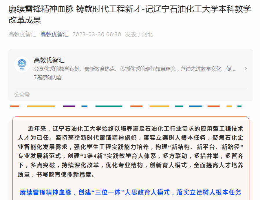 編者按:近日,高教優(yōu)智匯微信公眾號(hào)、人民日?qǐng)?bào)客戶端·人民號(hào)、遼寧日?qǐng)?bào)·北國(guó)號(hào)等媒體平臺(tái)對(duì)我校堅(jiān)持高舉新時(shí)代雷鋒精神旗幟,落實(shí)立德樹人根本任務(wù),聚焦石化企業(yè)智能化發(fā)展需求,強(qiáng)化學(xué)生工程實(shí)踐能力培養(yǎng),構(gòu)建“新結(jié)構(gòu)、新平臺(tái)、新路徑”專業(yè)發(fā)展新范式,創(chuàng)建“1鏈4新”實(shí)踐教學(xué)育人體系,多方聯(lián)動(dòng),多措并舉,多管齊下,多點(diǎn)突破,持續(xù)深化改革,優(yōu)化專業(yè)結(jié)構(gòu),創(chuàng)新育人模式,全面提高人才培養(yǎng)質(zhì)量,書寫教育使命新篇章進(jìn)行了宣傳報(bào)道。現(xiàn)將相關(guān)報(bào)道轉(zhuǎn)載如下: