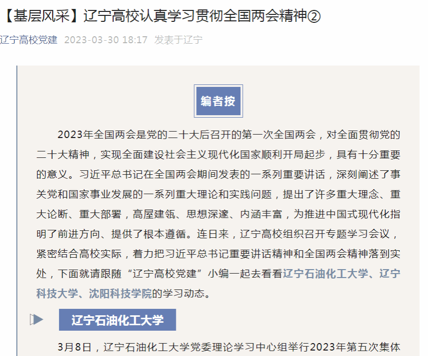 編者按:近日,遼寧高校黨建微信公眾號對遼寧高校組織召開專題學習會議,緊密結合高校實際,著力把習近平總書記重要講話精神和全國兩會精神落到實處進行了宣傳報道,其中對我校黨委理論學習中心組舉行2023年第五次集體學習,專題學習習近平總書記在參加江蘇代表團審議時的重要講話精神,深入學習習近平總書記在看望參加政協(xié)會議的民建工商聯(lián)界委員時的重要講話精神進行了組稿。現(xiàn)將相關報道轉載如下: