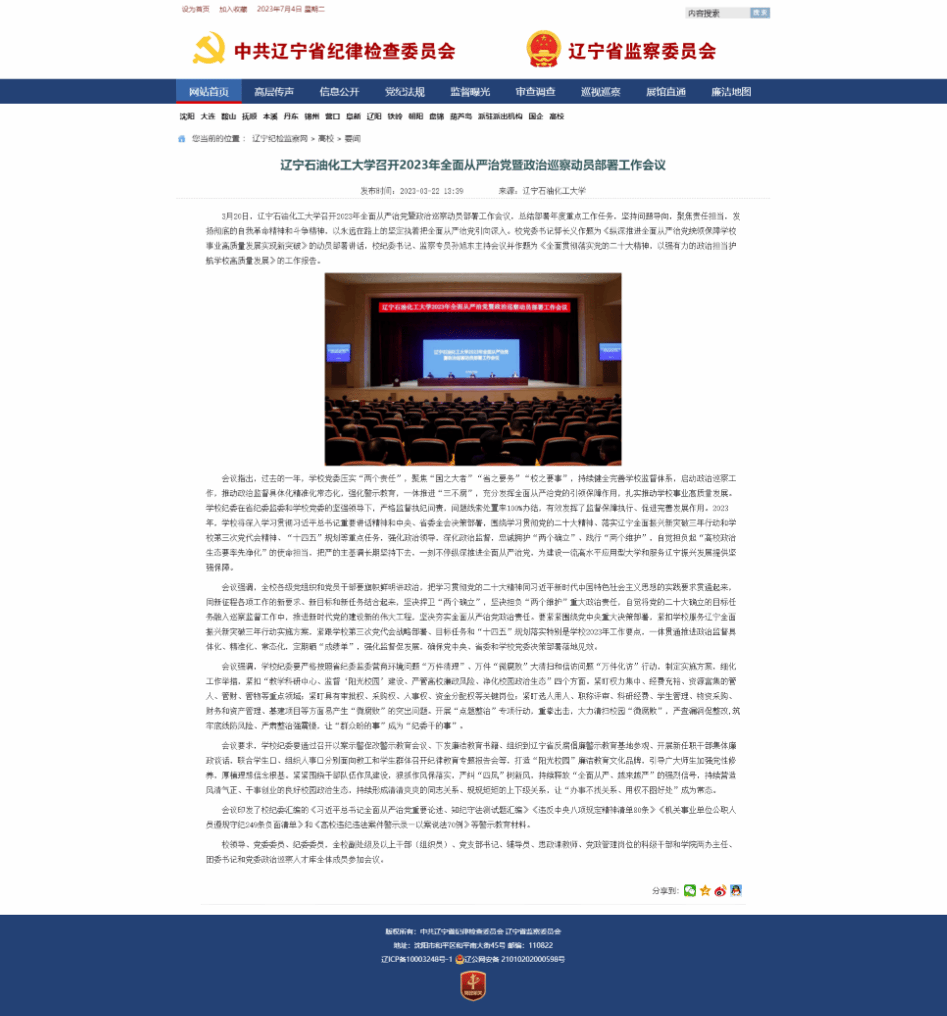 編者按:2023年3月22日,遼寧紀檢監(jiān)察網以《遼寧石油化工大學紀委召開“以案為鑒、以案促改”警示教育大會》為題,對學校召開2023年全面從嚴治黨暨政治巡察動員部署工作會議進行了宣傳報道。現(xiàn)將相關報道轉載如下: