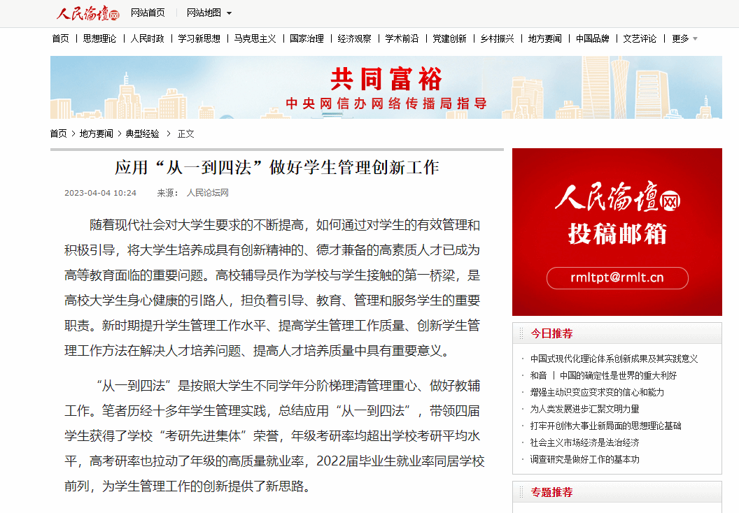 編者按:近日,我校石油天然氣工程學院張國花老師撰寫的學生管理創(chuàng)新典型經(jīng)驗《應用“從一到四法”做好學生管理創(chuàng)新工作》在人民論壇網(wǎng)發(fā)表,現(xiàn)將相關報道轉(zhuǎn)載如下: