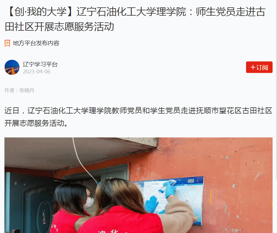 編者按:近日,學(xué)習(xí)強國遼寧學(xué)習(xí)平臺對我校理學(xué)院教師黨員和學(xué)生黨員走進(jìn)撫順市望花區(qū)古田社區(qū)開展志愿服務(wù)活動進(jìn)行了宣傳報道。現(xiàn)將相關(guān)報道轉(zhuǎn)載如下: