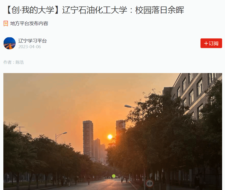 編者按:近日,學習強國遼寧學習平臺對我校宣傳部選送的新媒體工作室陳浩同學拍攝的校園美景落日余暉圖集進行了宣傳報道。現(xiàn)將相關報道轉載如下: