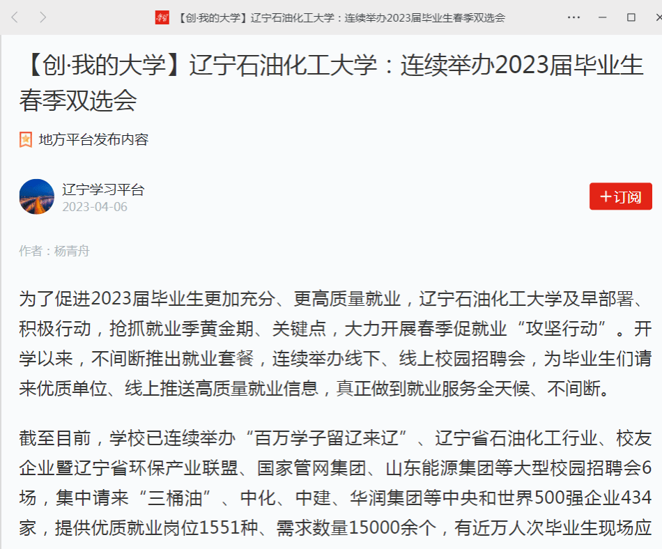 編者按:近日,學(xué)習(xí)強(qiáng)國(guó)遼寧學(xué)習(xí)平臺(tái)、人民日?qǐng)?bào)客戶(hù)端·人民號(hào)、遼寧日?qǐng)?bào)·北國(guó)號(hào)等媒體平臺(tái)對(duì)我校連續(xù)舉辦2023屆畢業(yè)生春季雙選會(huì)進(jìn)行了宣傳報(bào)道。現(xiàn)將相關(guān)報(bào)道轉(zhuǎn)載如下: