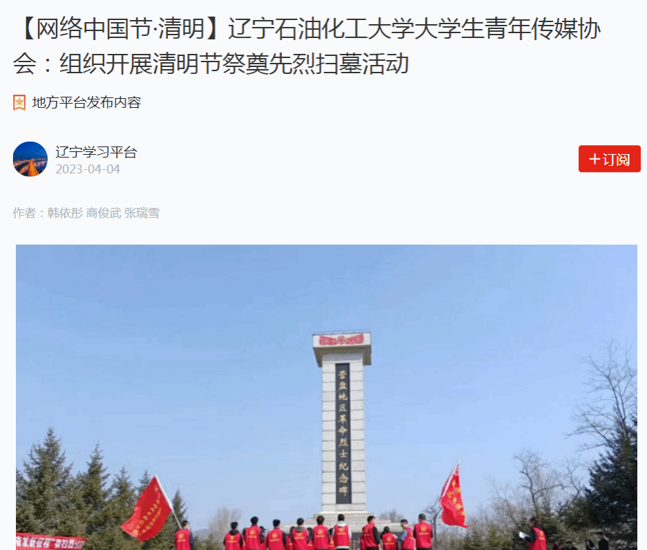 編者按:近日,學習強國遼寧學習平臺、人民日報客戶端·人民號、遼寧日報·北國號等媒體平臺對我校黨委宣傳部指導大學生青年傳媒協(xié)會組織志愿者走進撫順東洲區(qū)烈士陵園和哈達鎮(zhèn)烈士陵園開展“清明節(jié)祭奠先烈掃墓活動”進行了宣傳報道。現(xiàn)將相關報道轉(zhuǎn)載如下: