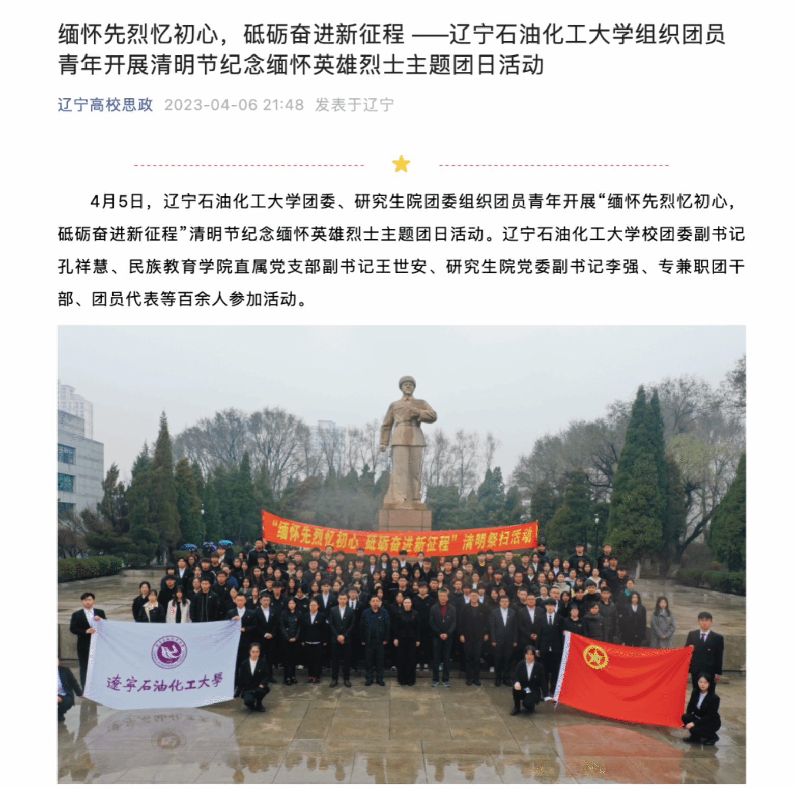 編者按:近日,遼寧高校思政、遼寧學聯(lián)對我校成功舉辦的緬懷先烈憶初心,砥礪奮進新征程——遼寧石油化工大學組織團員青年開展清明節(jié)紀念緬懷英雄烈士主題團日活動進行了宣傳報道。現(xiàn)將相關(guān)報道轉(zhuǎn)載如下: