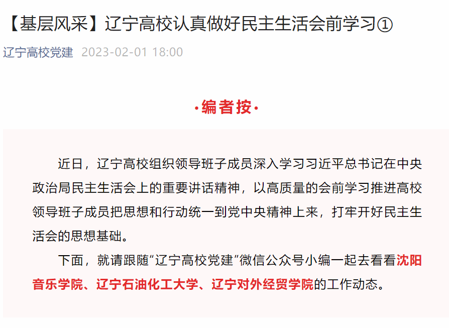 編者按:近日,遼寧高校黨建微信公眾號對遼寧高校認真做好民主生活會前學習進行了宣傳,其中對我校黨委理論學習中心組召開會議,深入學習習近平總書記在中央政治局民主生活會上的重要講話精神等內容作了組稿報道。現將相關報道轉載如下: