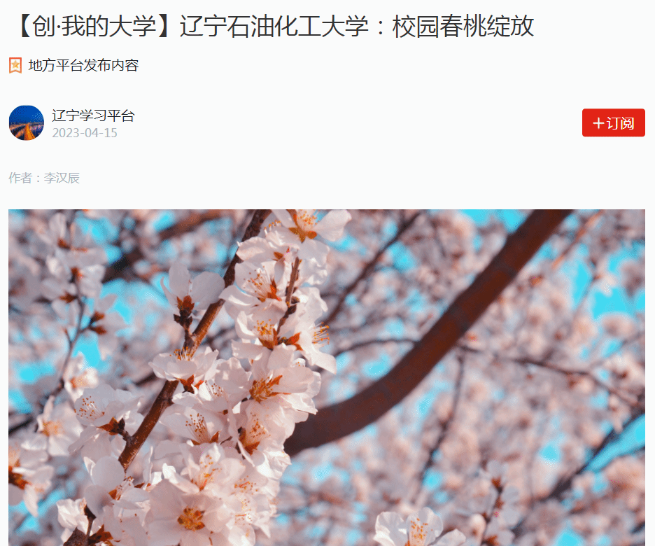 編者按:近日,學習強國遼寧學習平臺對我校宣傳部選送的李漢辰同學拍攝的校園春桃花圖集進行了宣傳報道。現將相關報道轉載如下: