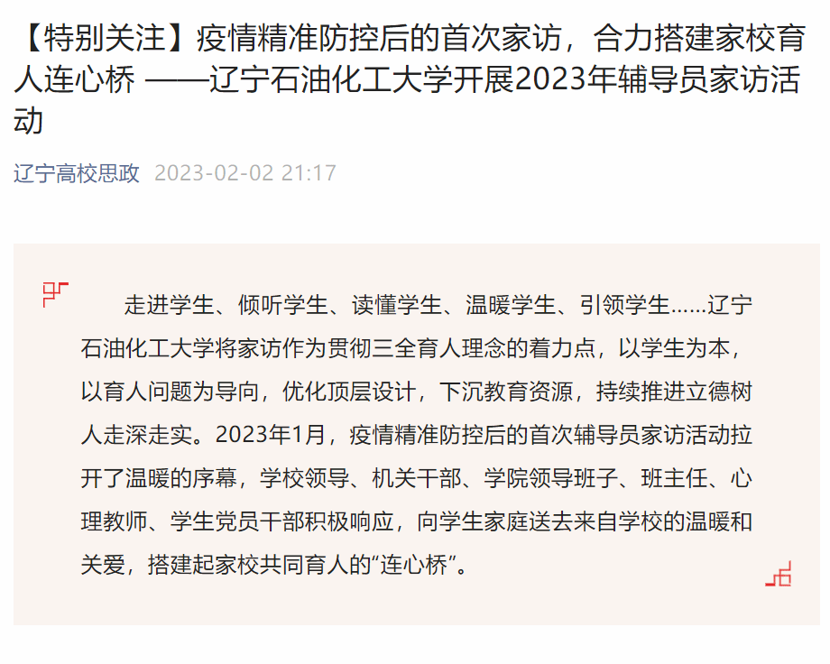編者按:近日,遼寧高校思政微信公眾號對將家訪作為貫徹三全育人理念的著力點,以學生為本,以育人問題為導向,優(yōu)化頂層設計,下沉教育資源,持續(xù)推進立德樹人走深走實,開展2023年輔導員家訪活動進行了宣傳報道。現將相關報道轉載如下: